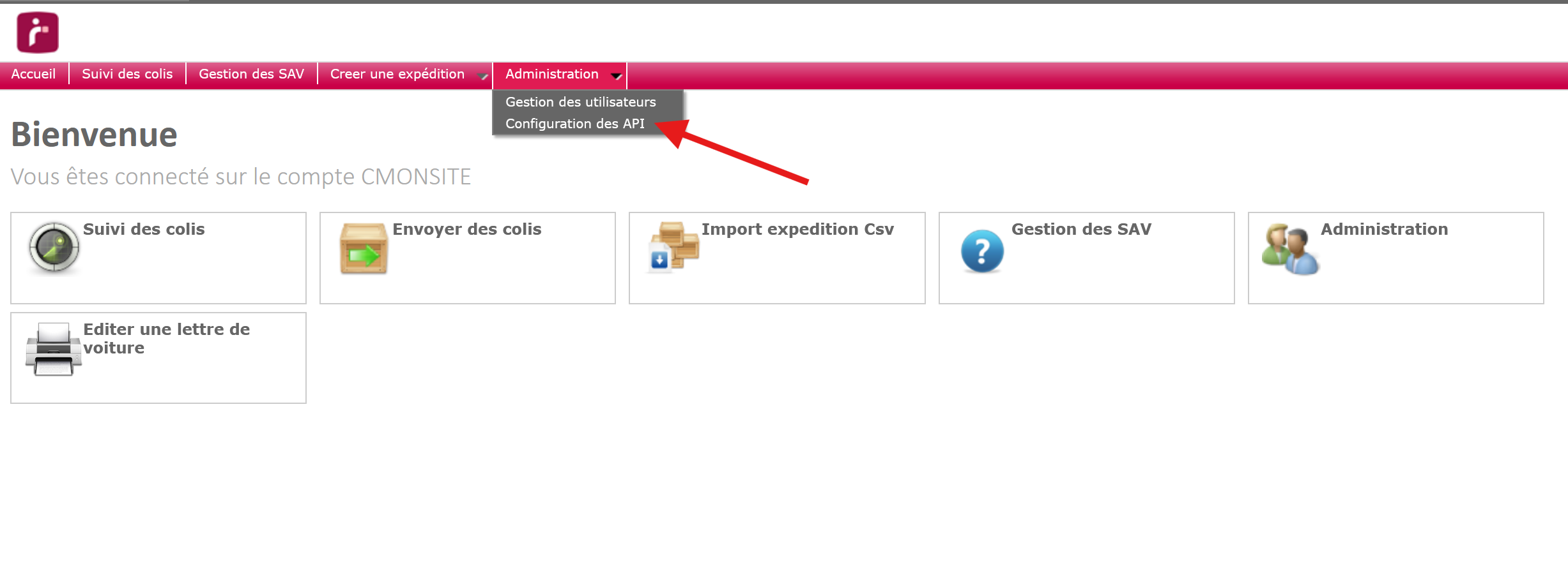 Dans l’onglet “Administration”, cliquez sur “Configuration des API”.