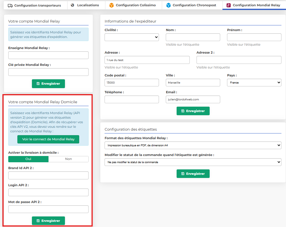 Sur cette page, vous pourrez activer la livraison à domicile via Mondial Relay et saisir les identifiants générés précédemment.