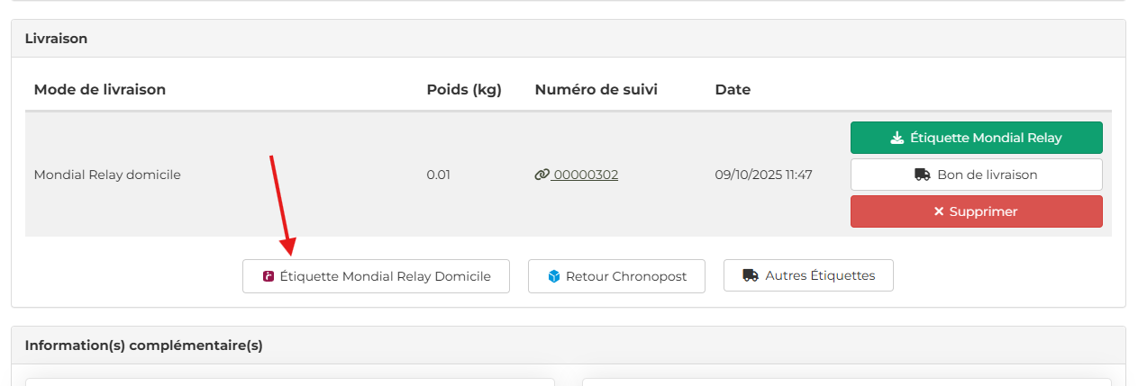 Vous pourrez ensuite générer l’étiquette Mondial Relay Domicile depuis l’interface de votre commande.