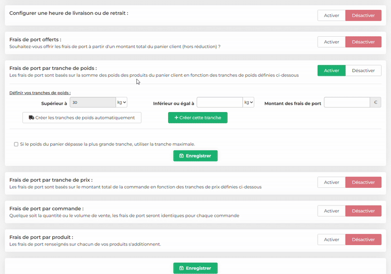 - Si vous souhaitez appliquer des frais de port en fonction du poids, vous pouvez générer automatiquement ces tranches.