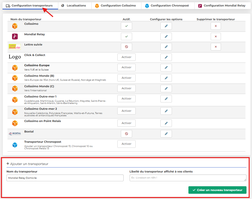 - Reproduisez la même opération avec un nouveau transporteur « Mondial Relay Point Relais ».