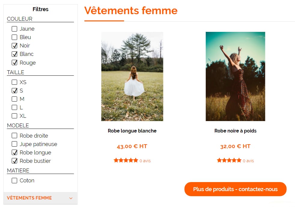 Renouvelez l’opération pour chacun de vos produits pour qu’ils puissent ressortir lorsque votre visiteur utilise les filtres, comme dans l’exemple ci-dessous.